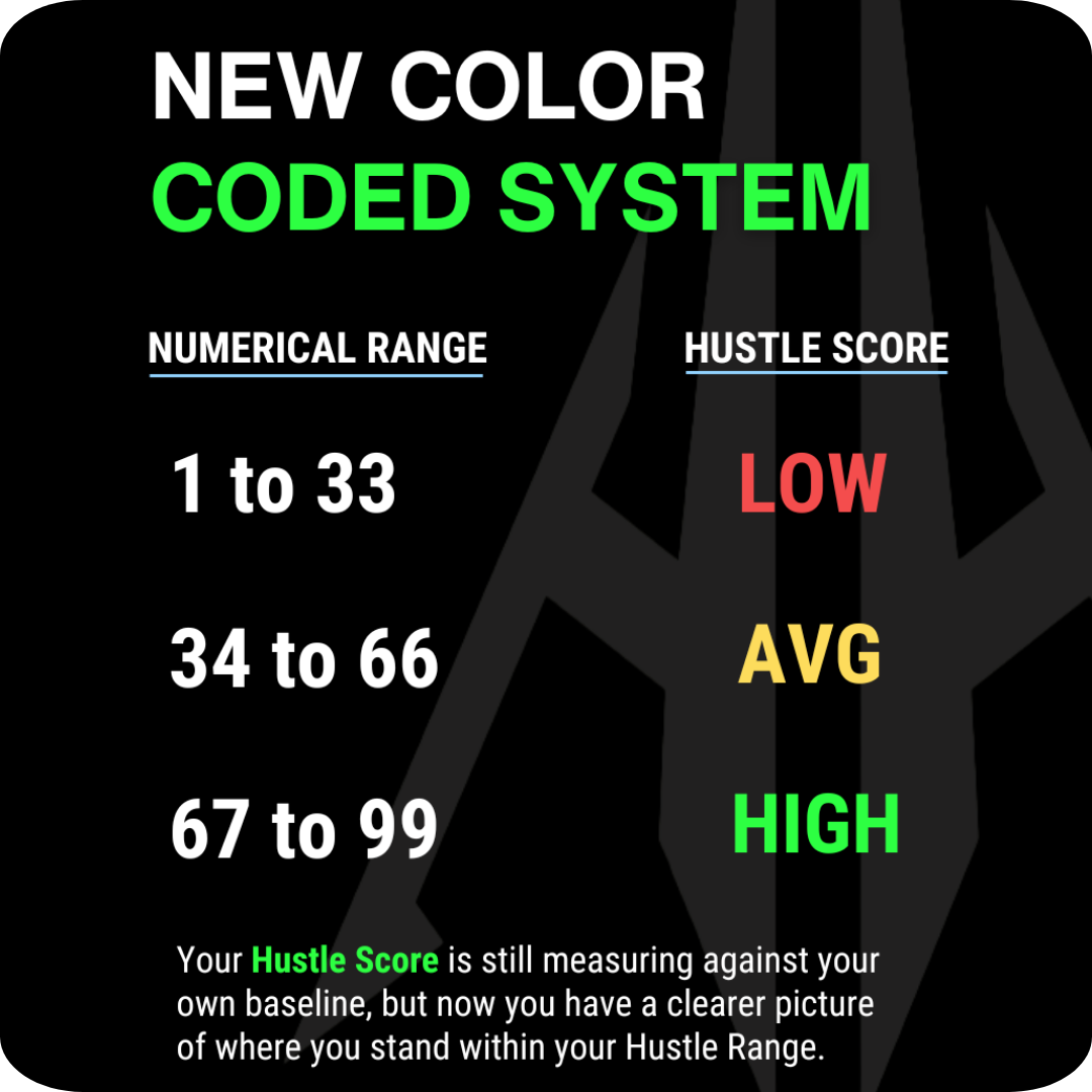 Your Hustle Score is now a numerical value and includes a color-coded effort level at the end of every session. No guessing. No hiding. Just clear proof of how hard you worked.