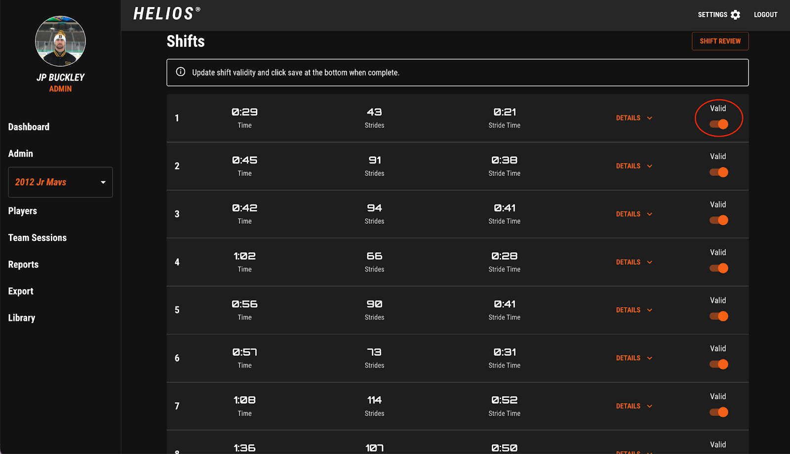You can review your shifts and decide whether to validate or invalidate shift. This can be helpful if you want to remove a Warmup “shift” from a player, or if a short shift was deemed invalid but you want to include it in a player’s data.
