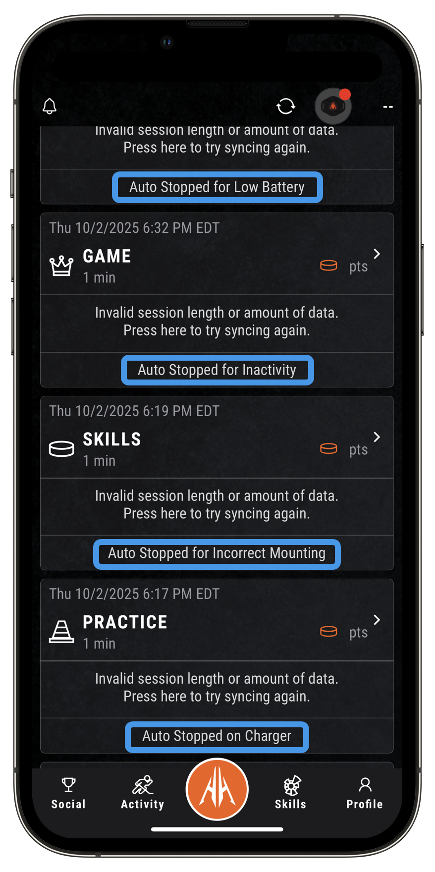 If you've synced a session and are seeing “Invalid Session Length or Amount of Data”, this means the session didn’t capture enough skating to be considered valid.